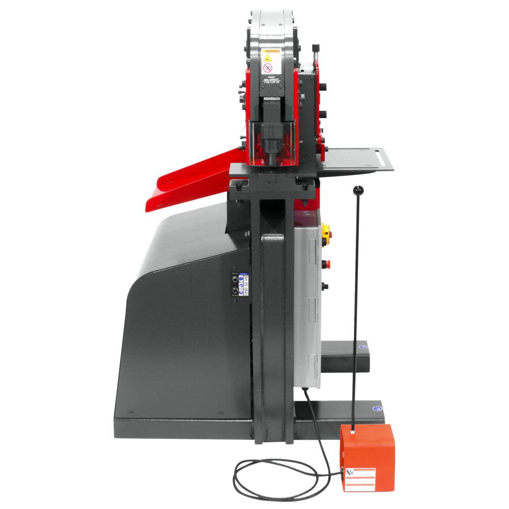 The Edwards 50 ton ironworker is ideal for the small shop that needs a powerful, versatile tool for all kinds of tasks. Standard features include a punch assembly with pedestal die table, flat bar shear, angle shear and a dedicated coper notcher station. The punch assembly quickly converts to an open tooling station designed to accept optional tooling accessories.