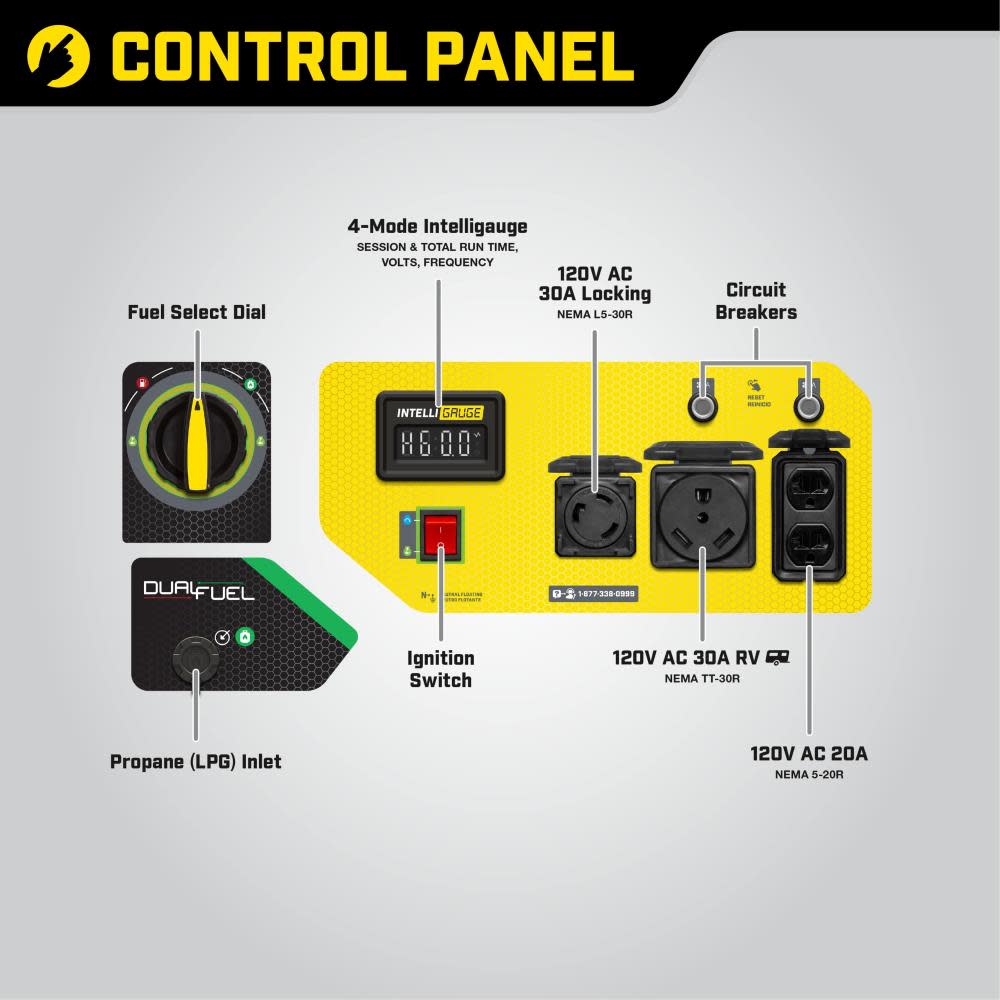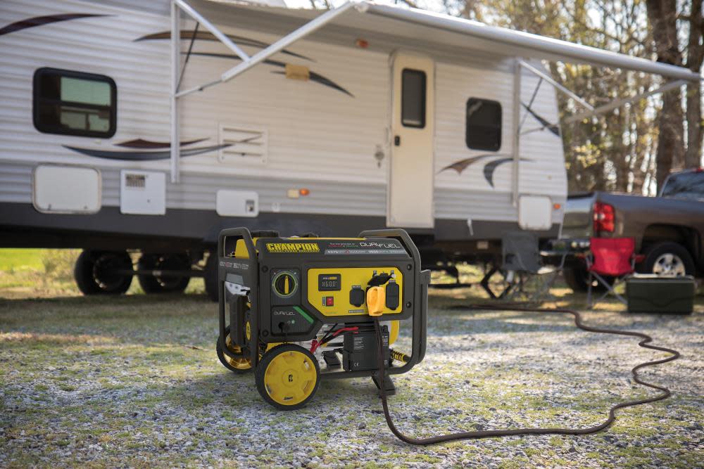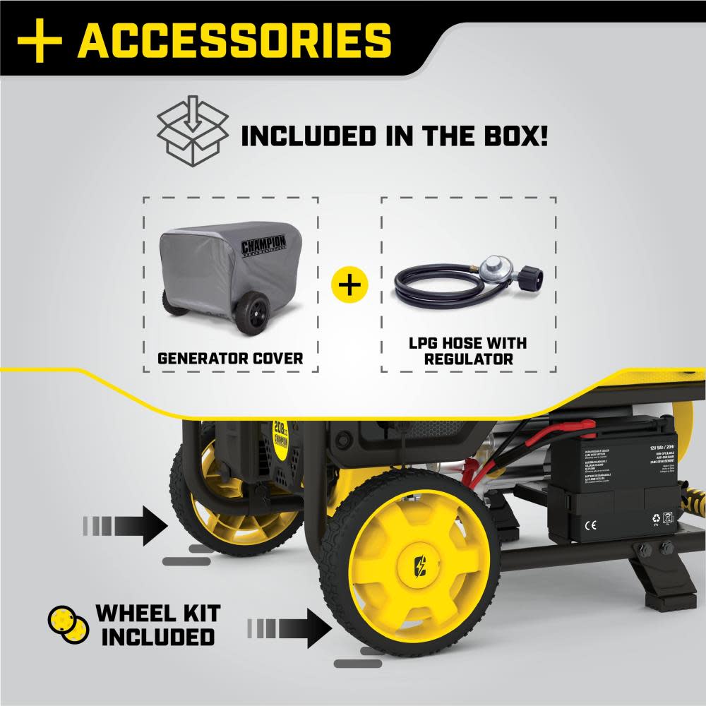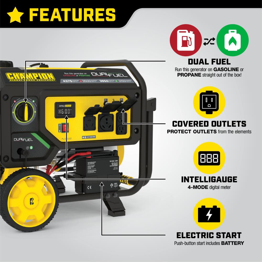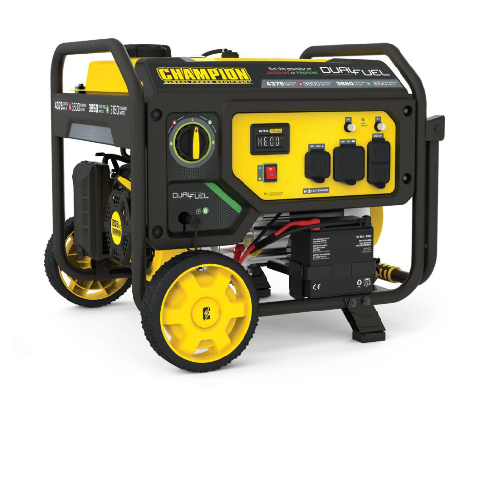 The Champion Power Equipment 200966 3500-Watt Dual Fuel Portable Generator is the perfect combination of versatility and convenience. Whether you need power for your home or next project, Champion Power Equipment makes powering your life more convenient than ever. The convenient electric start includes a battery, plus Cold Start Technology ensures a quick start in cold weather. Easily monitor output and track maintenance intervals with Intelligauge, which allows you to keep track of voltage, frequency and run-time hours. Designed with a low oil shut-off sensor, this unit includes 0.6-quarts of 10W-30 oil. Operate your Dual-Fuel generator right out of the box on gasoline or propane, and easily switch fuels with our patented fuel select dial that allows for safe switching between fuel sources. Using gasoline, the 208cc Champion engine produces 4375 starting watts and 3500 running watts, and will run for 14 hours at 50% load when the 4.7-gallon fuel tank is full. It produces 3950 starting watts and 3150 running watts, and will run for 10.5 hours at 50% load when using a 20-pound propane tank. Also included is a 6.5-foot propane hose with a built-in regulator. With a noise level of 68 dBA from 23 feet, which is a bit louder than a vacuum, this machine can provide home backup in an outage, plus the Volt Guard™ protects your generator from electrical voltage spikes. All the outlets have covers for protection and include a 120V 30A (TT-30R) RV outlet, a 120V 30A outlet (L5-30R), and two 120V 20A household outlets (5-20R). Champion’s thoughtful packaging and clear directions make setup hassle free, plus the foldaway U-shaped handle makes it easy to store, while the never-flat tires in the included wheel kit make transport a cinch. Buy this EPA certified and CARB compliant generator with confidence – Champion Support and our nationwide network of service centers will back up your purchase with a 3-year limited warranty and FREE lifetime technical support.