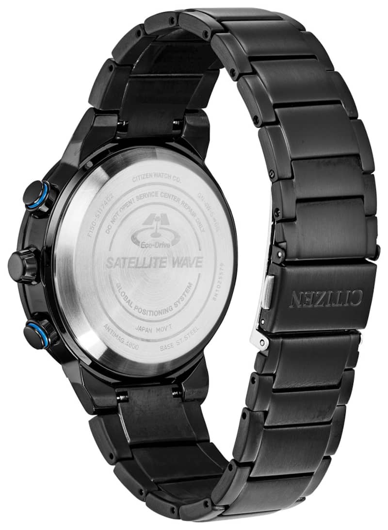 Citizen Eco-Drive Satellite Wave GPS Freedom 44mm Watch w/ Black w/ Blue Accents Dial & Ion-Plated Stainless Steel Bracelet, Model CC3038-51EBolder and brighter. Enhanced technical and architectural design; the new Citizen Satellite Wave GPS Freedom is the leader of the pack with the world’s fastest timekeeping signal reception speed from GPS navigation. A sleek black ion-plated stainless steel case and bracelet, black dial and brilliant blue accents featured satellite GPS timekeeping technology with worldwide reception and time adjustment in 40 time zones. Powered by Eco-Drive technology – powered by light, any light. Never needs a battery. Caliber number F150. Features Movement Technology