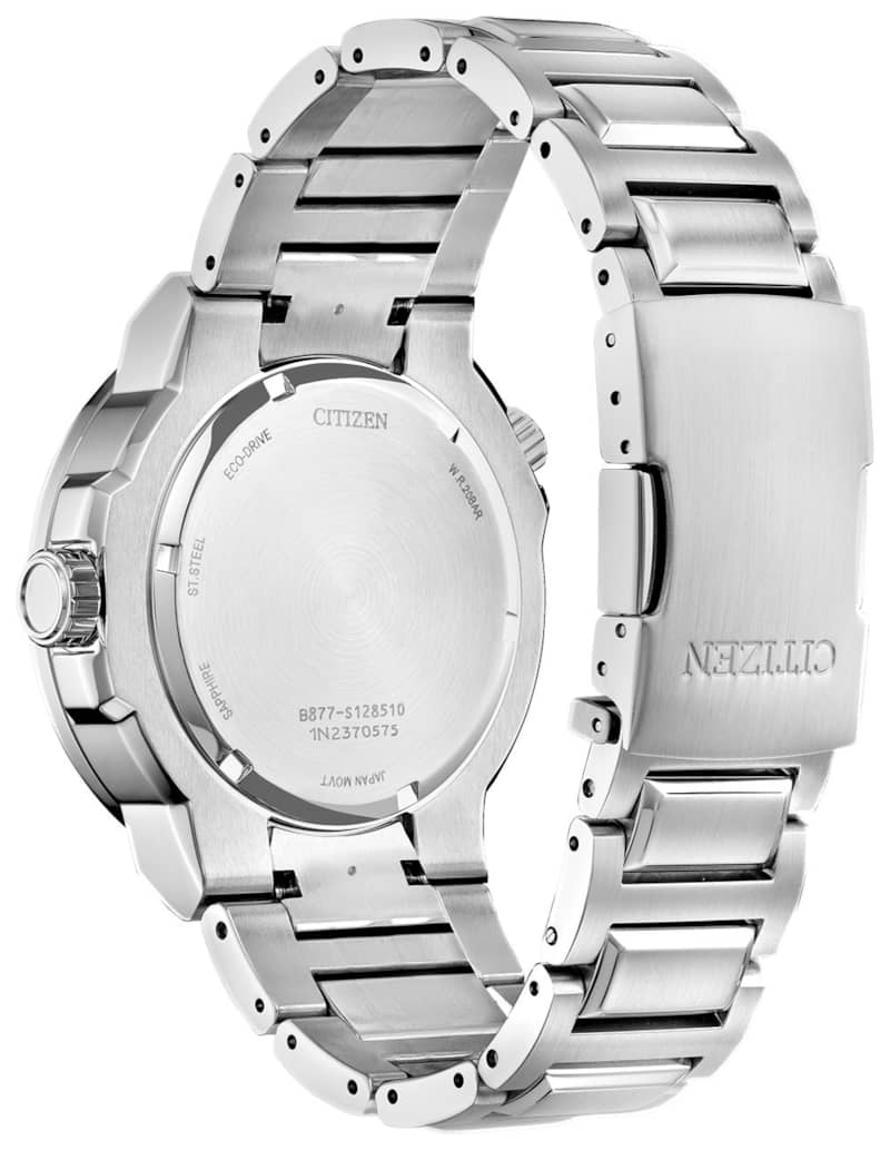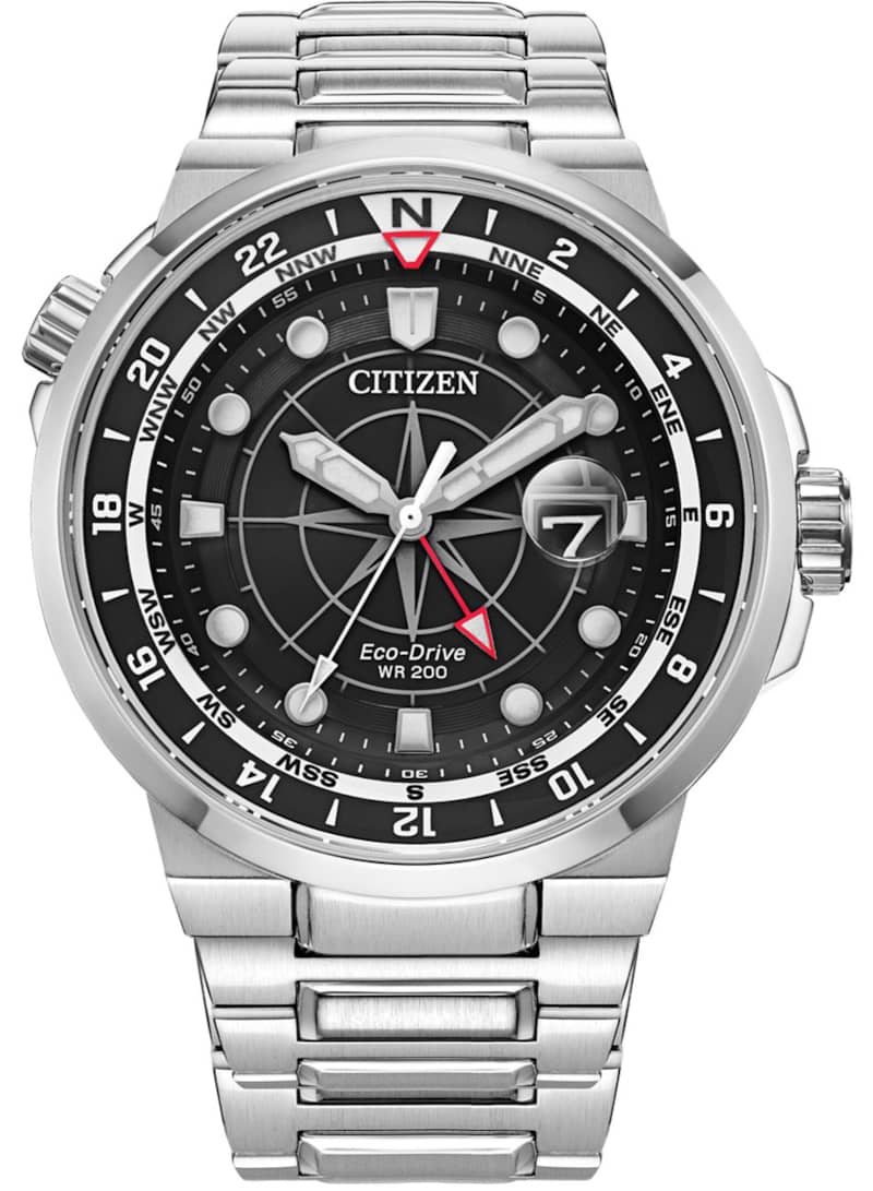 Citizen Eco-Drive Endeavor GMT 44mm Watch w/ Black Dial Silver-Tone Stainless Steel Bracelet, Model BJ7140-53EVenture into our sport luxury collection with the Endeavor timepiece for next level style and function. The updated design in silver-tone stainless steel features a 3-hand black dial with a dual time zone and magnified date, luminous hands and markers, and an anti-reflective sapphire crystal. This timepiece also features a fold-over clasp closure with hidden push buttons and is water resistant to 200 meters. For a men’s watch that makes a standout style statement, the Endeavor is the perfect choice. Featuring our Eco-Drive technology – sustainably powered by any light and never needs a battery. Caliber number B877. Features Movement Technology