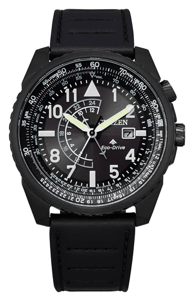 Citizen BJ7135-02E Eco-Drive Promaster Nighthawk 42mm Black Mens WatchWith a 42mm three-piece case, the Promaster Nighthawk from Citizen is inspired by the clean, sleek lines of military stealth helicopters. This watch possesses an all-black design — including a leather strap — and bold white accents alongside advanced features such as Eco-Drive technology, dual time zones, luminous hands and markers and a three-hand dial with the date means it’s ready to go on any missions you might embark on. Features