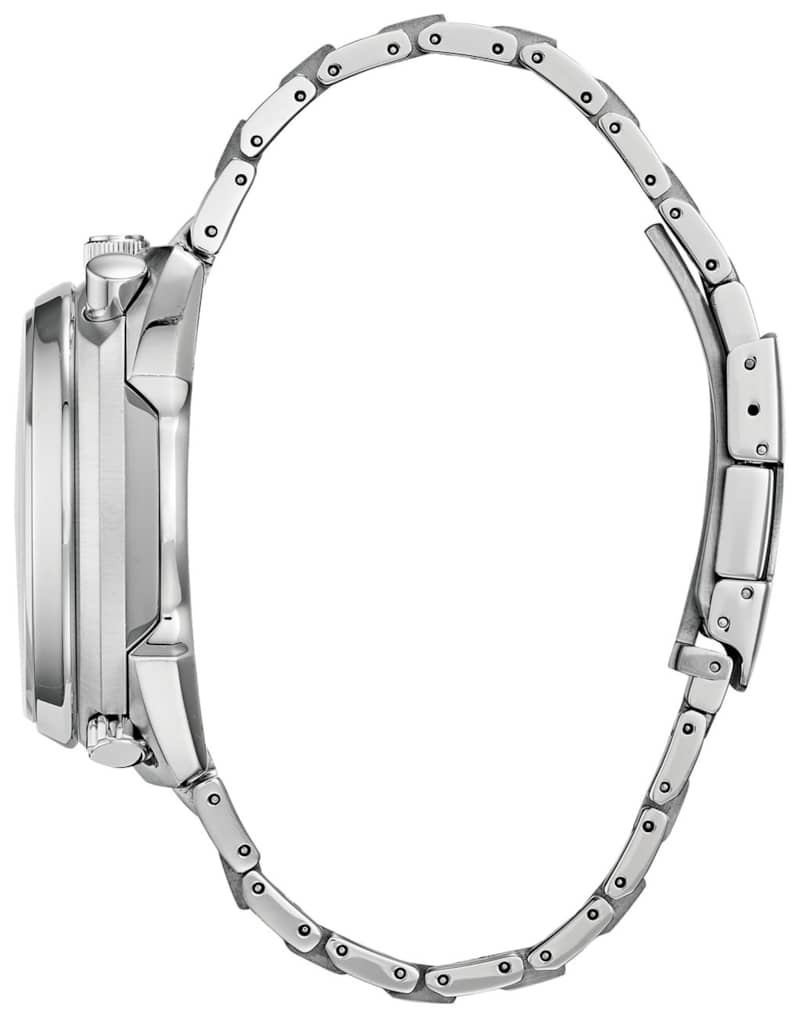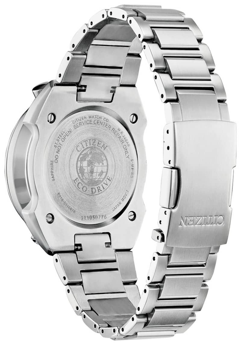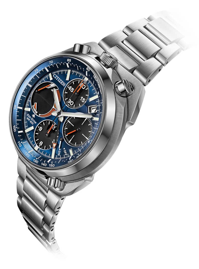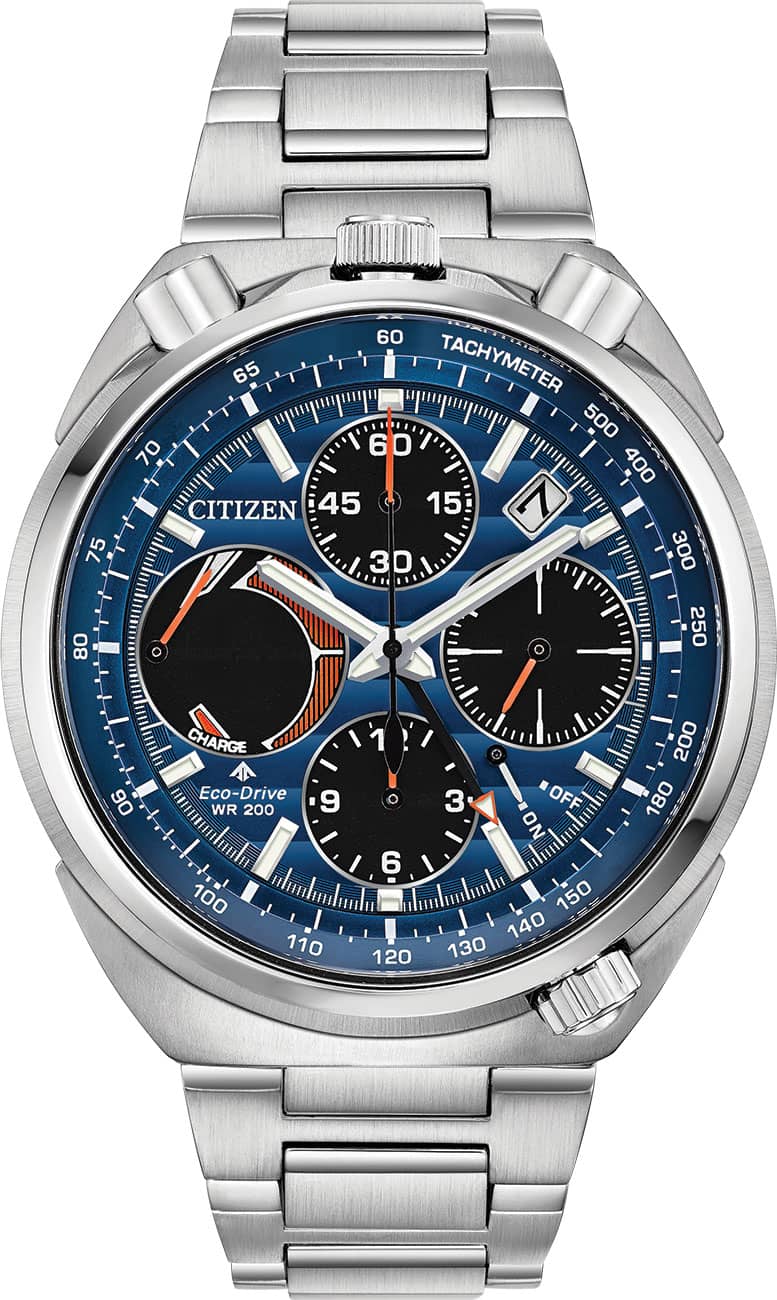 Citizen Eco-Drive Promaster Tsuno 45mm Chronograph Racer Watch w/ Blue Dial Silver-Tone Stianless Steel Bracelet, Model AV0070-57LPaying homage to a retro 1973 CITIZEN Bullhead model, the newly modernized CITIZEN Tsuno Chrono Racer showcases a unique case styling, trendy color combinations and is sure to stand out on your wrist. A hand assembled movement, the Tsuno Chrono Racer features 1/5-second chrono, alarm, tachymeter, instaneous flyback, power reserve and date. Seen here in a stainless steel case and bracelet with azure and black dial. Featuring our Eco-Drive technology – powered by light, any light. Never needs a battery. Caliber number E210. Features Movement Technology