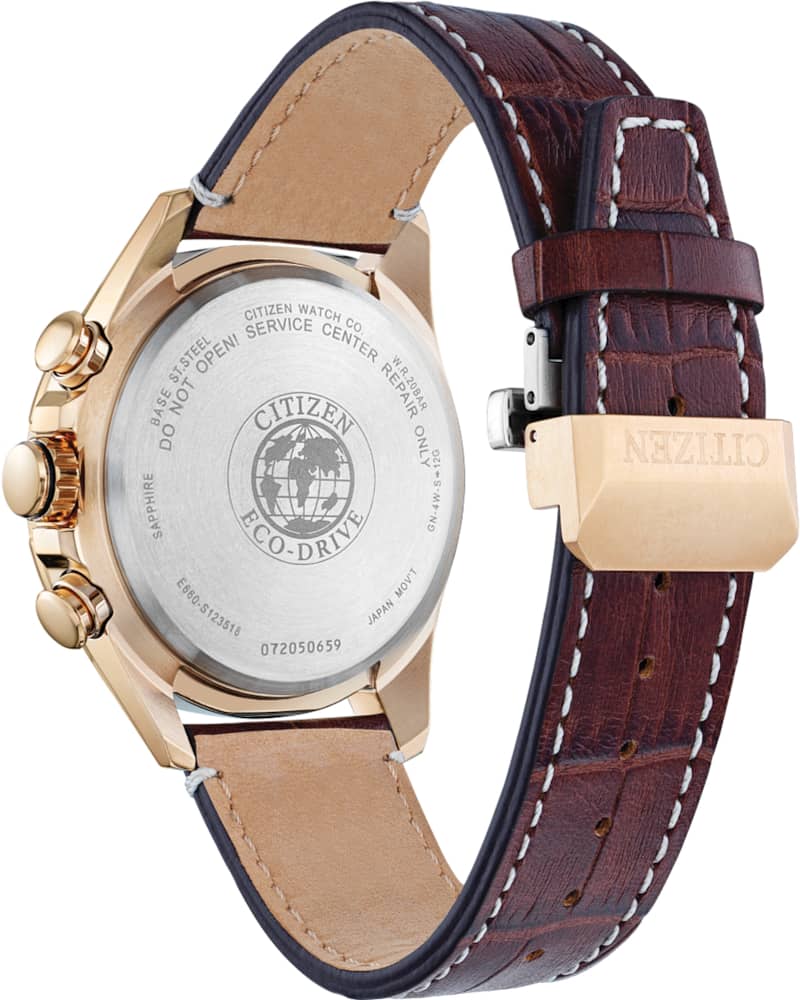 Citizen Eco-Drive PCAT 43mm Chronograph Watch w/ Green Dial & Brown Leather Strap, Model CB5919-00XThe PCAT from Citizen is a must-have timepiece for any enthusiast. Additional features include atomic timekeeping with synchronized time adjustment in 43 cities worldwide, Eco-Drive technology, perpetual calendar, power reserve indicator and a chronograph. It has a brown leather strap and 43mm rose-gold tone stainless-steel case with a stylish green dial. For anyone looking to blend timelessness with technology, this watch will hit all the buttons. Features Movement Technology