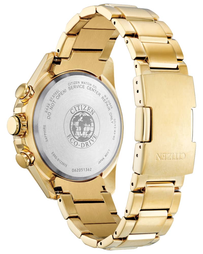 Citizen Eco-Drive PCAT 43mm Chronograph Watch w/ Black Dial & Gold-Tone Ion-Plated Stainless Steel Bracelet, Model CB5912-50EThe PCAT from Citizen is an updated take on an iconic design, with refreshed features and design aesthetic, while maintaining the classic dial for this iconic collection. Features include the Tachymeter bezel, a world timer, perpetual calendar, power reserve indicator, chronograph, atomic timekeeping with synchronized time adjustment in 43 cities worldwide and radio control. It has a gold-tone stainless-steel band and 43mm case, with a black dial for a timeless look that can be dressed up or down. Add in Eco-Drive technology for a functional watch that will always be in style. Features Movement Technology