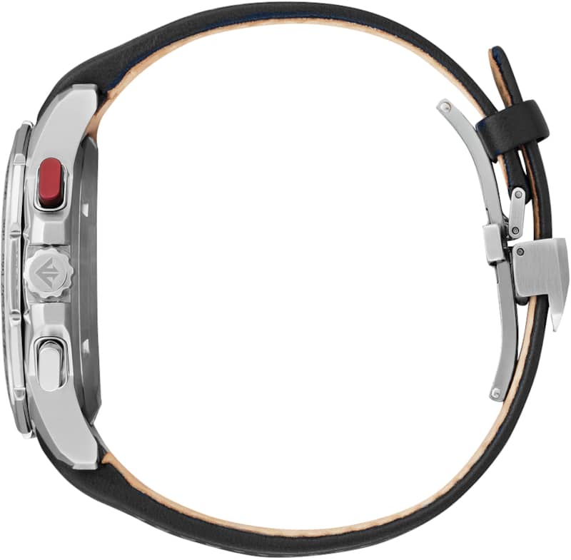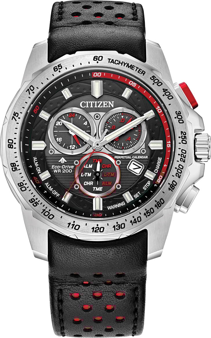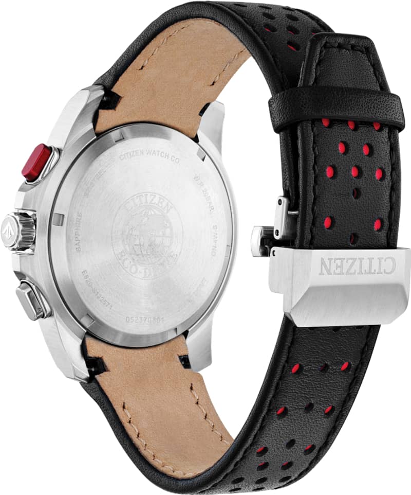 Citizen Eco-Drive Promaster MX 43mm Chronograph Watch Black Dial & Leather Strap w/ Red Accents, Model