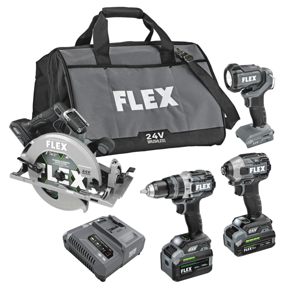 Show up to the jobsite in full force with four FLEX SENSOR-FREE™ Brushless motor essentials. This kit combines the powerful cutting capabilities of the FLEX 7-1/4″ Circular Saw with the torqued-out FLEX 1/2″ 2-Speed Hammer Drill and FLEX 1/4″ Hex Impact Driver. Plus, do it all while commanding ultimate jobsite visibility with the FLEX Work Light. Total FLEX 24V cross-compatibility also means these tools share the FLEX Stacked Lithium Advantage of unmatched 24V battery power, runtime, and charging capability. Kit includes all four tools, two 24V batteries, and charger.