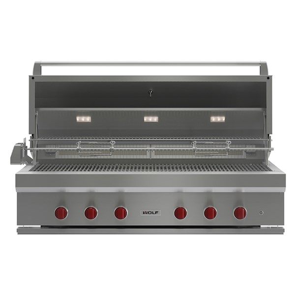 - Grill any time of day with LED-lit signature Wolf red, black,or stainlesscontrol knobs