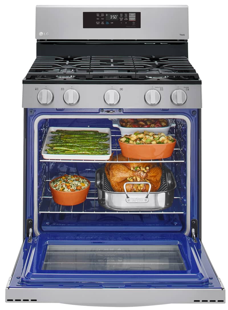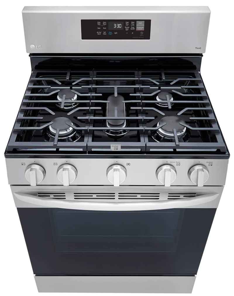 LG Gas Range with Air Fry & EasyCleanEnjoy double duty cooking with this LG gas range. A powerful gas cooktop and large lower oven come together for an appliance that elevates your cooking. Those looking for healthier meal options (or just want crispy food without the mess) will love the built-in air fry cooking mode; with little to no oil, you can enjoy lighter versions of your deep-fried favorites like chicken wings or fries. Air fry mode also means you don’t have to purchase an additional appliance, keeping your kitchen counters free of clutter. On the cooktop rests LG’s fastest burner yet, the UltraHeat™ 20,000 BTU burner. Its impressive cooking power is perfect for time-consuming tasks like boiling water, allowing you to get dinner on the table faster. Once you’ve finished cooking, the PrintProof™ finish makes cleaning up a breeze; it resists fingerprints and smudges so you can simply wipe clean. Best of all, the stainless steel finish will look sleek, modern and attractive amongst the rest of your LG kitchen appliances. Cook Smarter with LGThis LG gas range also features the brand’s signature ThinQ smart technology, which allows you to connect the range to your home WiFi and control it from your smartphone. If you’re at work, you can use the app to set the oven to preheat so you can start dinner as soon as you arrive home. You can also monitor the cooking progress from your phone so you don’t have to interrupt other meal preparation processes. The ThinQ app also offers Proactive Customer Care, which alerts you of potential repairs or operational issues with your appliance so you can schedule a repair as needed. Beyond that, ThinQ also features Smart Cooking, which allows you to pair your oven with popular cooking apps to set the correct cooking time and temperature for specific dishes. Whether you’re enjoying a family dinner or preparing a weekend feast, this stainless steel LG gas range is here to help. To learn more about this appliance or any of its features, call 847-954-4100 to speak with one of our experts. You can find additional information in our kitchen range buying guide. Features