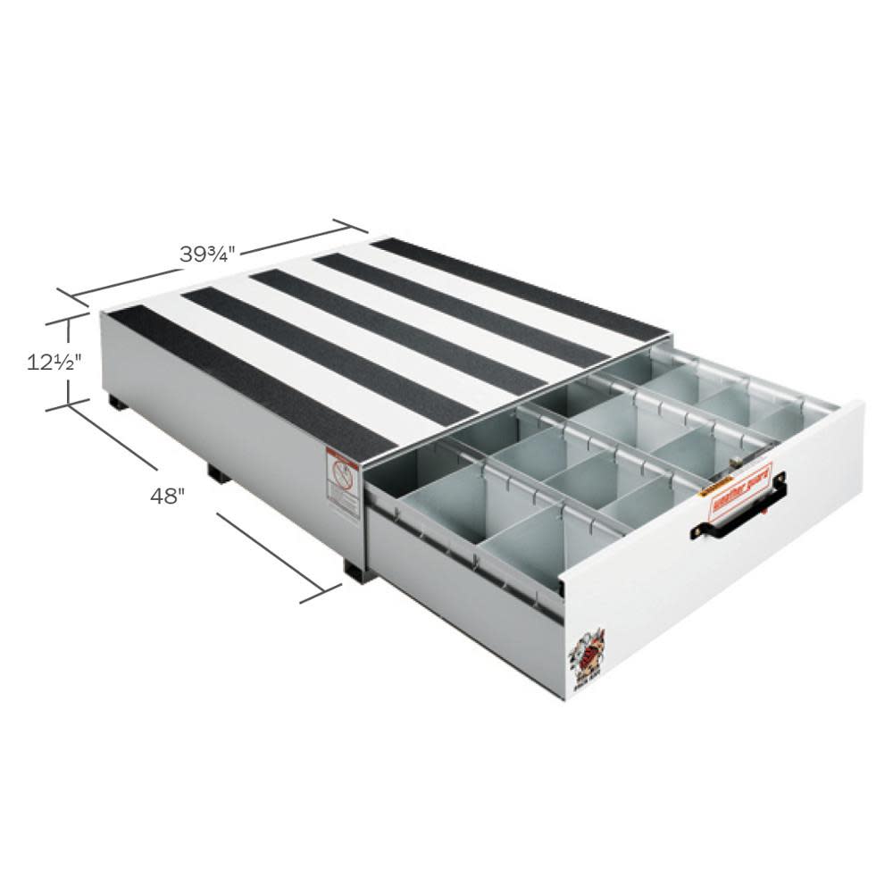 The WEATHER GUARD® Steel PACK RAT® Drawer Unit with Four Compartments keeps your tools organized in the bed of your pickup truck. The container measures 12-1/2-inches (H) by 20-inches (W) by 48-inches (L). It features four separate compartments and includes 24 removable dividers that allow for complete customization. The sturdy steel body holds up to 750 pounds and comes with a flat top surface, so you retain all the room you need for larger materials. The heavy duty storage box features roll-out compartments to facilitate access even when you load the drawers with tools, and the units body features an ARMOR-TUF® coating to withstand exposure to the elements.