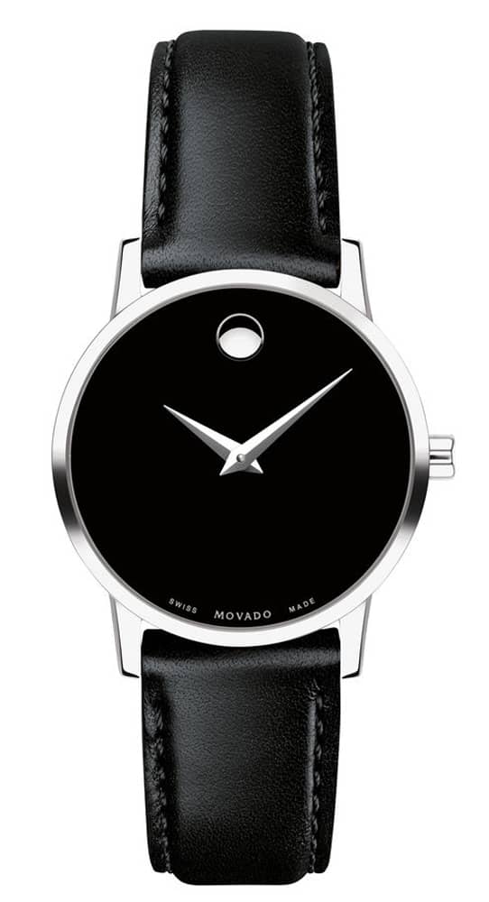 Movado Museum Classic 28mm Watch w/ Black Dial & Leather Strap, Model 0607274Women’s Museum Classic watch, 28 mm stainless steel case, black Museum dial with silver-toned dot and hands, smooth black calfskin strap with stainless steel buckle. Beyond The Dot: